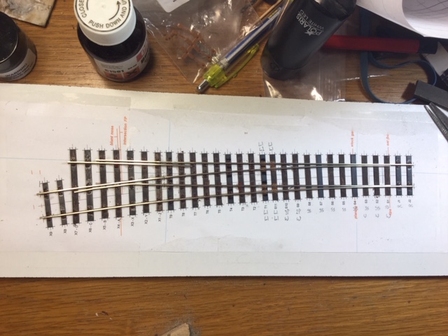 This apparently incomplete point is a finished handbuilt GWR style trap point for Heyno Junction. The guard and wing rails are a scale 2″ higher than the running rails so the switch rail runs up a gradient that takes the wheels over the top of the mainline running rail. It saves the expense of constructing a crossing (V) and the mainline rail is unbroken so you don’t get the wear that a crossing suffers. It seems to work even in model form with the out of scale wheel flanges.