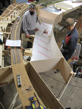 Rob glued up the last scenic board behind PV (well almost the last – apparently there might be another one). The picture shows DaveH being permanently built into the scenery by Rob. This way he’ll always be available for viaduct maintenance…
