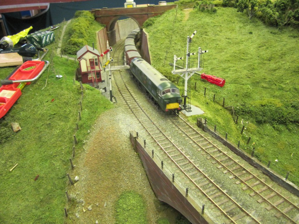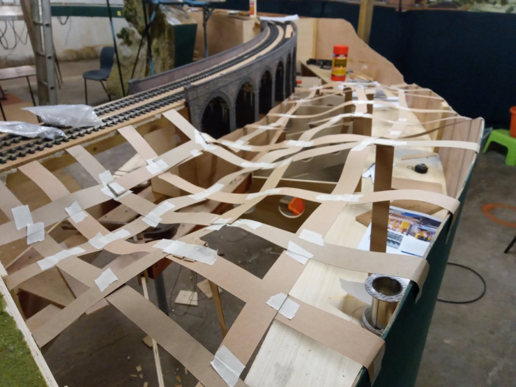 And so to the current state of play at the Prestleigh Viaduct end of Evercreech New (EN). DaveS thought he’d do a bit of terraforming. It’s all held together with masking tape and so is easily removed/changed/forgotten about. Because the viaduct has the correct orientation to the station, the land in front of the viaduct needs to rise up towards the viewer outside the layout. It looks good to us!