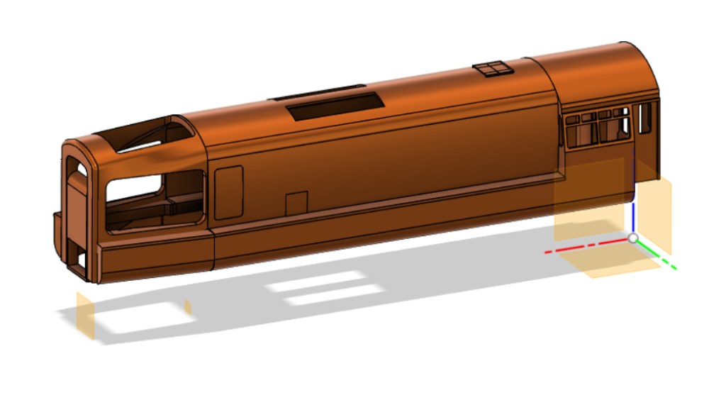 A 3D CAD design for the body of Bob’s GT3. In the process of producing it DaveS is steadily getting to grips with Fusion360. In 7mm scale it proved a little too large to be printed in one piece on any of the 3D printers immediately available to the membership, but could be filament printed in two parts with a lot of supports. DaveS was on his way home after picking it up and took it to show him on the day Bob died.