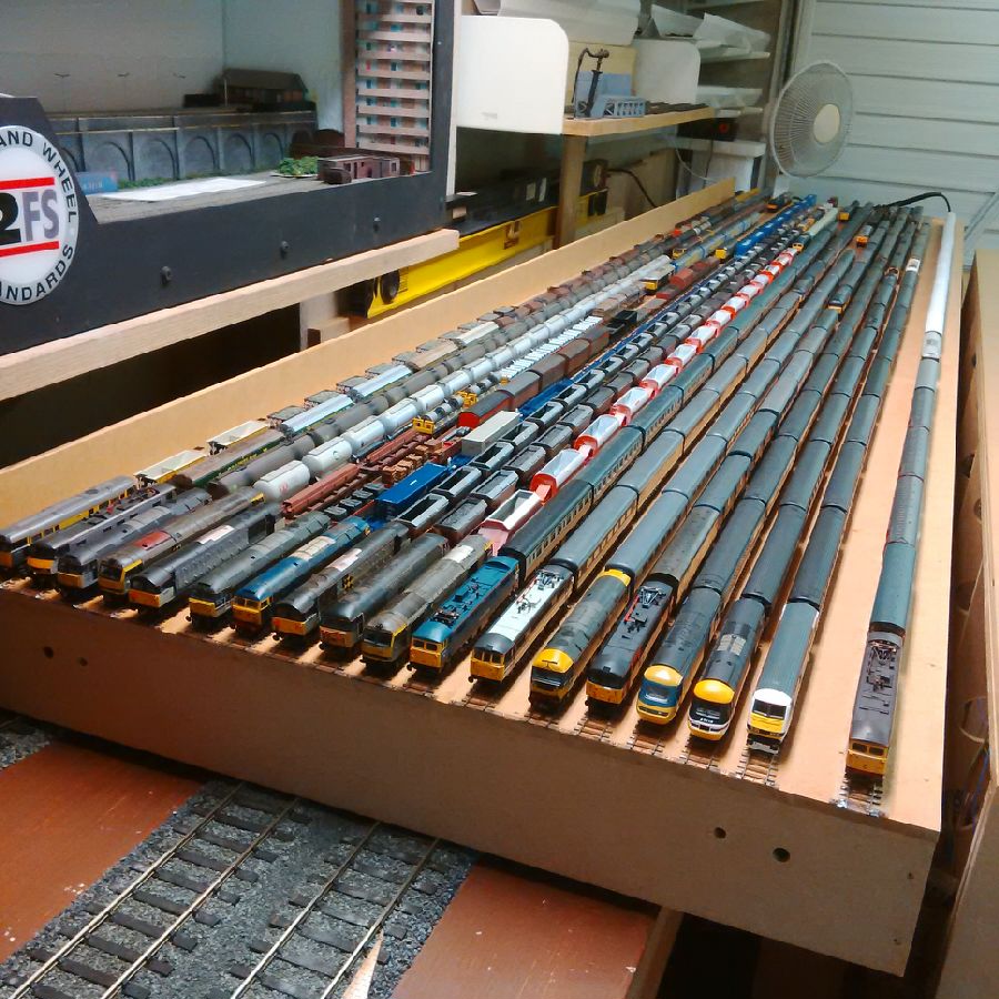 We have all wondered why Jim went all the way to Aberdeen a year ago to collect an unwanted 30ft long 18 road fiddle yard in 2mm FS. He couldn’t possibly have enough trains to fill it, we said?