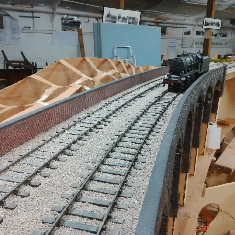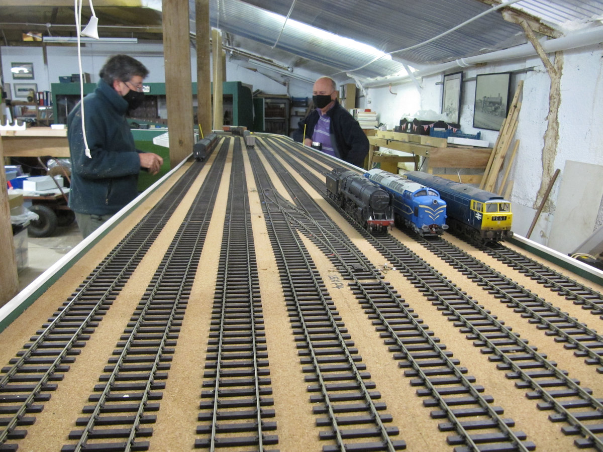 On the 5th November several of the EN team met to get the viaduct back into running order as a last protest against the impending lock down. We did it – both tracks are now wired and running well ready for balasting. Traffic seen included a 9F, the prototype Deltic, Dave H’s 990 4-4-0 with Bob Alderman’s LMS coaches, a Pannier with all the wagons we could muster and a blue diesel belonging to Tim. Sadly Dave Sapp’s class 40 didn’t make it out of the box in one piece – get well soon class 40. The Goods train advertised its presence round the layout by a squeaky axle on the brake van – no change there then (Ed)! Rob did some final tidying up on the scenic baseboards, and Steve is kindly sieving genuine Mendip stone ballast for us. Work on Holly and Heyno Junction continued.