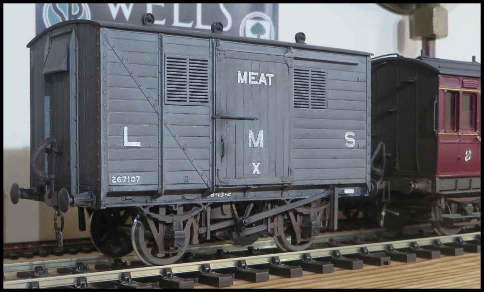 The now completed Parkside LMS meat van. In what will prove to be a disappointing blog for the rivet counters out there, purists may query the under scale lettering, Allan being too mean to buy one sheet of 0 gauge HMRS Pressfix transfers for just one model (actually two – there’s the other LMS box van previously published on this site). He used the largest lettering that he could find from a 00 sheet as the transfers included in the kit don’t work for him. There are no heating pipes fitted – the assumption being that these vehicles were attached to express fitted freight trains not passenger trains.
