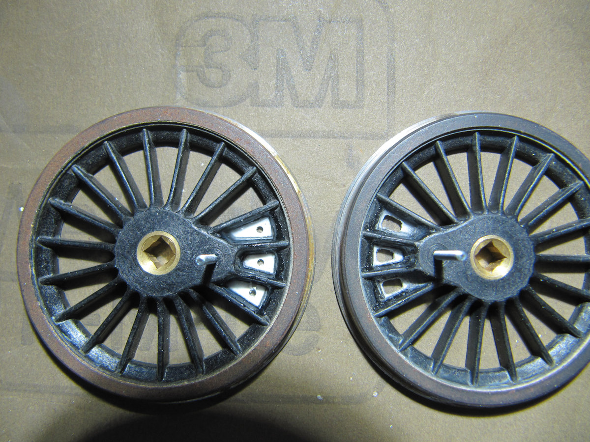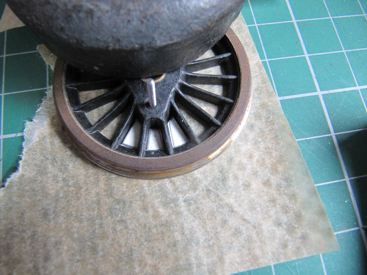 The centre driving wheels (on my prototype) have stiffening webs round the crank pins. This detail was added to the wheels along with the balance weight etchings. Note to self, do not use the thick end of a cocktail stick to paint with – a brush may give better results.