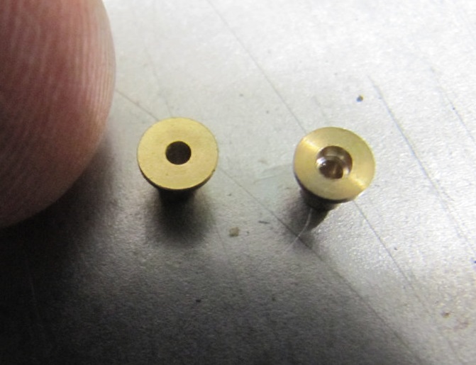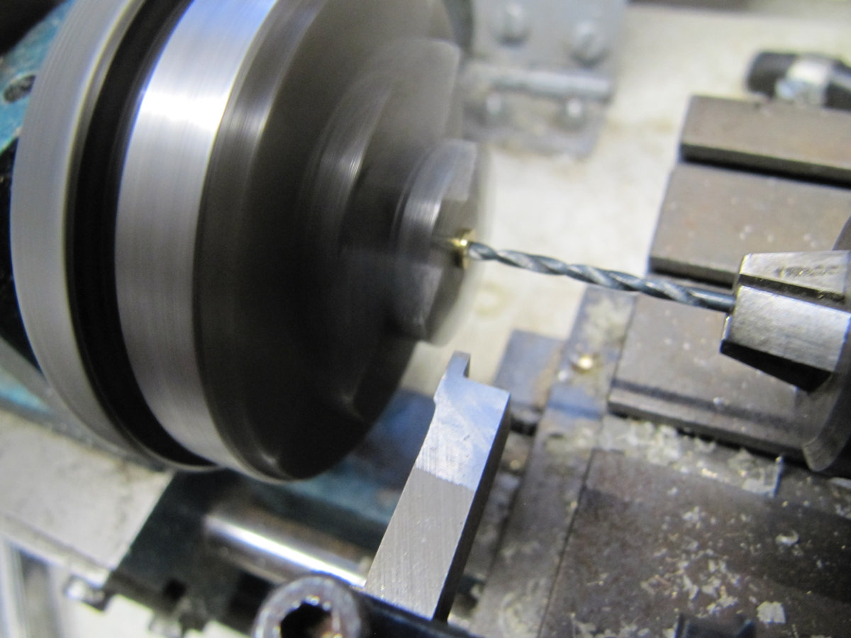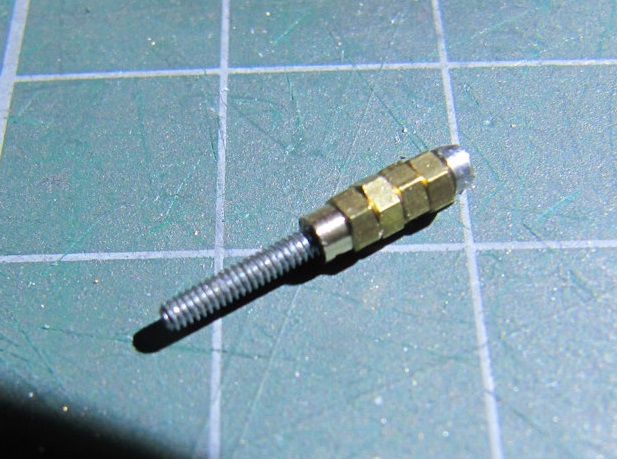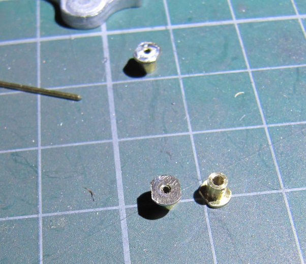 Take six 12BA nuts (you’ve got 6 cranks to do) and assemble them on a long 12BA screw. Put the assembled nuts and screw in a small drill, the threaded end being held in the chuck. While the drill is revolving, use a file to take the corners off the nuts until they are round and about the size of the screw head. Measure the diameter of the filed nuts so that you can stop when you get to the size of available drill – I used 2.1mm. Next put a Top Hat Bearing (THB) in your lathe. Drill into the THB to a depth not greater than a modified nut. Other methods of doing this are available. Put a modified nut into the hole in the THB. They were a tight fit and needed to coaxed in with a hammer. Check that a 12BA screw goes nicely through the assembly. Add a small bit of solder round the nut. I had an oiled 12BA screw in place so that solder did not go down the thread. A quick filing finished off the assembly.
