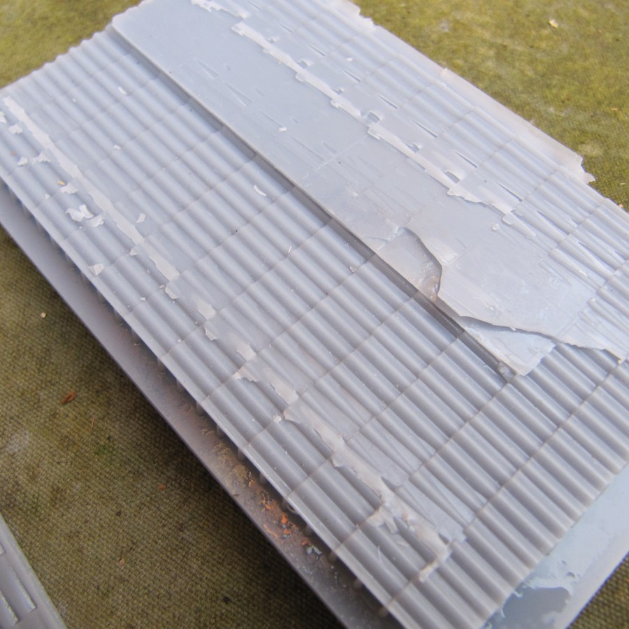 It is most unlikely that the interior was ever lined or painted so is light grey to represent galvanised zinc ,and the framing is bare wood. The window is far too fresh looking and needs weathering. No laser cutting or etching for this one – it was all done the old-fashioned way. Of the three corrugated iron huts at Verwood that were in the immediate station environs and therefore should have been painted green – the lamp hut was black (ish), the ground frame green (ish), and the only colour photo showing the weighbridge hut (in next month’s update if your editor is spared) appears to show it to have been pale blue. This last is now thought to be a colour cast in the Instamatic photo, and it is actually just grey (ish) with a white window- but what colour to paint the door? It does seem to be a darker shade as does the roof.