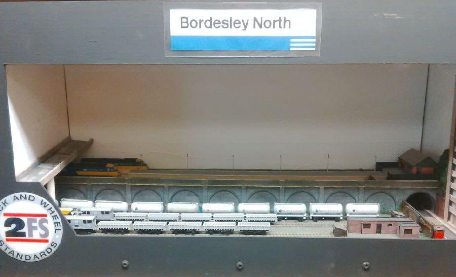 The layout is due to appear at the 2mmFS Diamond Jubilee “Show within a Show” at Warley this November, delayed from 2020. However, before then, I need to install the backscene created from photographs I took of the Birmingham skyline and stitched together in Photoshop by Richard Doust (a member of the 2FS Kent & Essex Area Group). Also, a second board, depicting either the end of a Freightliner Terminal and/or a diesel depot, needs designing and building. This will be attached to the left end of the existing layout so there will be two separate cameos, fed by one central (cassette based) fiddle yard. Watch this space…