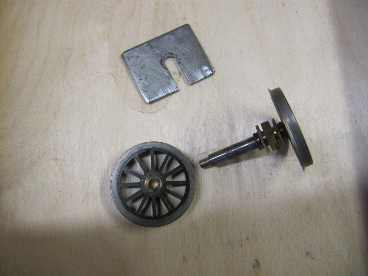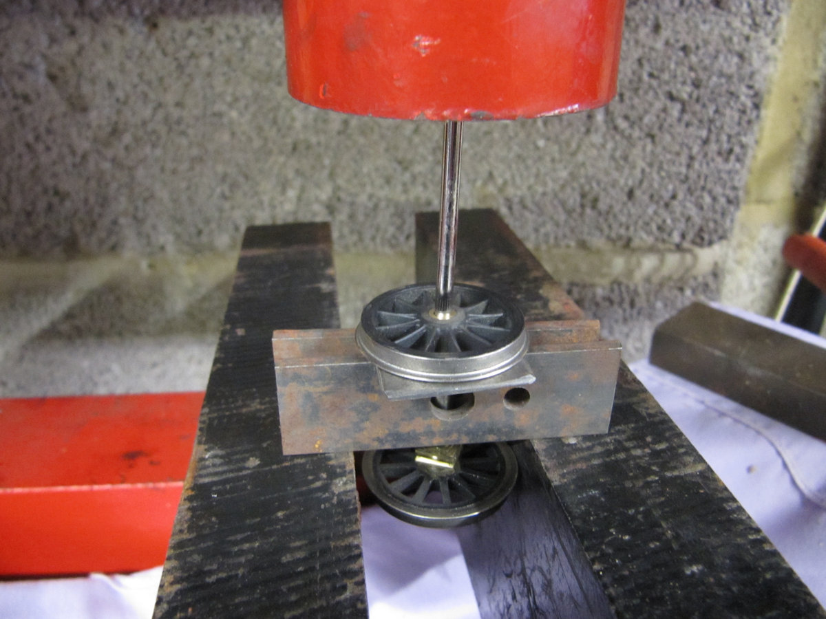 The consensus was that they were a press fit, and John hit the jackpot by identifying that they were in fact Slater’s wheels on a Morse taper. Dave S had already decided to try pressing the axle out from the wheel before John’s email arrived. So it was out with a collar that he had prepared earlier, and off to the garage where his 30 ton press lives. Not a lot resists Dave’s press and the Slater’s wheels and axles came apart easily. I’ll let the pictures do the talking now.