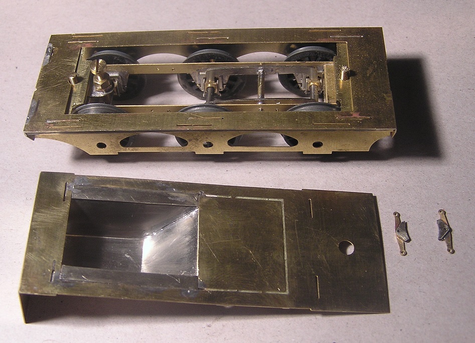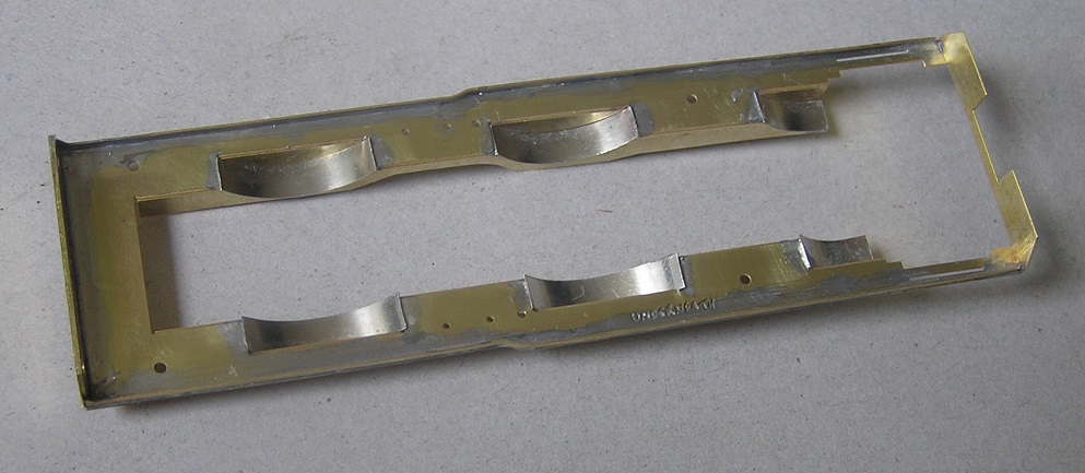 Work commenced with the running plate which in common with the Roche drawing doesn’t have the characteristic narrowing of the front half that the prototype had so that was the first challenge. The half etched splasher tops fell through the resulting holes once frame tops and splasher fronts had been folded up, so slightly wider ones cut from thin nickel silver were substituted. The half etched buffer beam was narrowed to match the reduced width of the running plate and laminated up for robustness before being soldered in. With half etched lines on only one side of the etch it was quite a relief to see the etched ‘underneath’ is indeed underneath! At that point the Airfix body was still in the post, so attention turned to the tender.