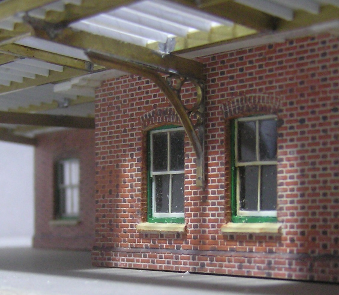 Verwood has not been forgotten and a lot of time has been spent on the canopy roof this month, firstly after a false start a much more satisfactory way of glazing the roof light was devised. The correctly spaced framing was drawn up in CAD and printed out. The glazing material was taped to this drawing and the supporting framing glued to the glazing material with Liquid Poly. The glazing material was then turned over and the assumed (overlapping) panes of glass scribed on. The glazing beads were then applied to complete the job. The completed assembly fits neatly in the hole in the canopy prepared for it, Flushed with success a start was made on the corrugated sheeting which had very visible lines of fastenings. There were four rows per sheet on most of it, and two rows on the rest. A jig centred the hole on the top of each ridge, with every fourth ridge being drilled – representing five ridges on the prototype. Each hole then received a short length of fine plastic rod trimmed to length. The rolled leadwork at the top of the skylight was also modelled.