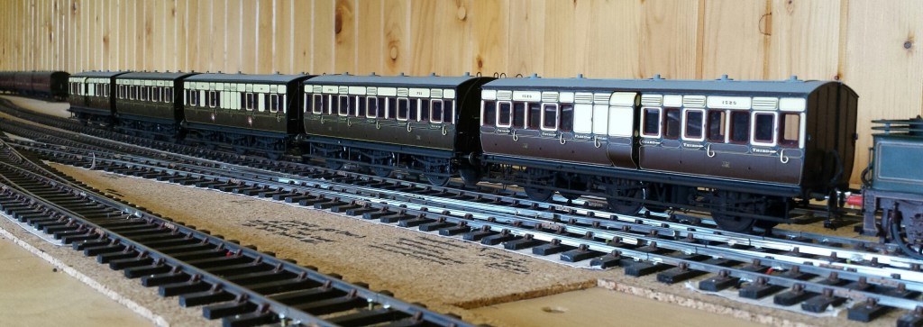 And with those buffers fitted and a coat of paint two Shelf Queens are now finished – both six wheel brake thirds. Our picture (and featured image) shows them top and tailing the first three which were finished in 2002! So his winter project has delivered about one third of its output with an overrun of 100% in time – though on a very low budget. The rest of the Shelf Queens will have to wait until another winter, but then as the days are already drawing in….