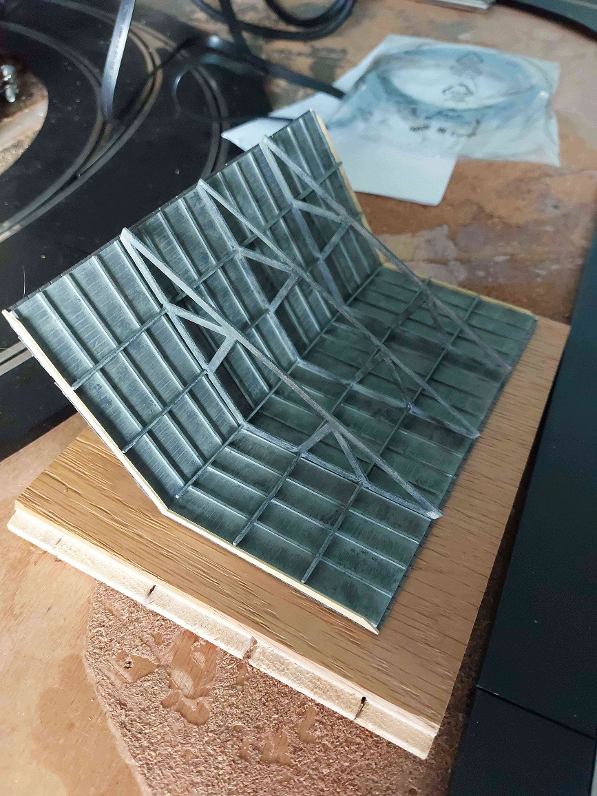 The stonework for the Goods Shed is now painted and ready to be varnished once the crane and its supports have been added to the interior, then this can all be weathered. The main roof structure was made up of 45 pieces of styrene and 3D print, before the tiling was added… the result is a solid, removable structure that will allow access and further detailing in the future.