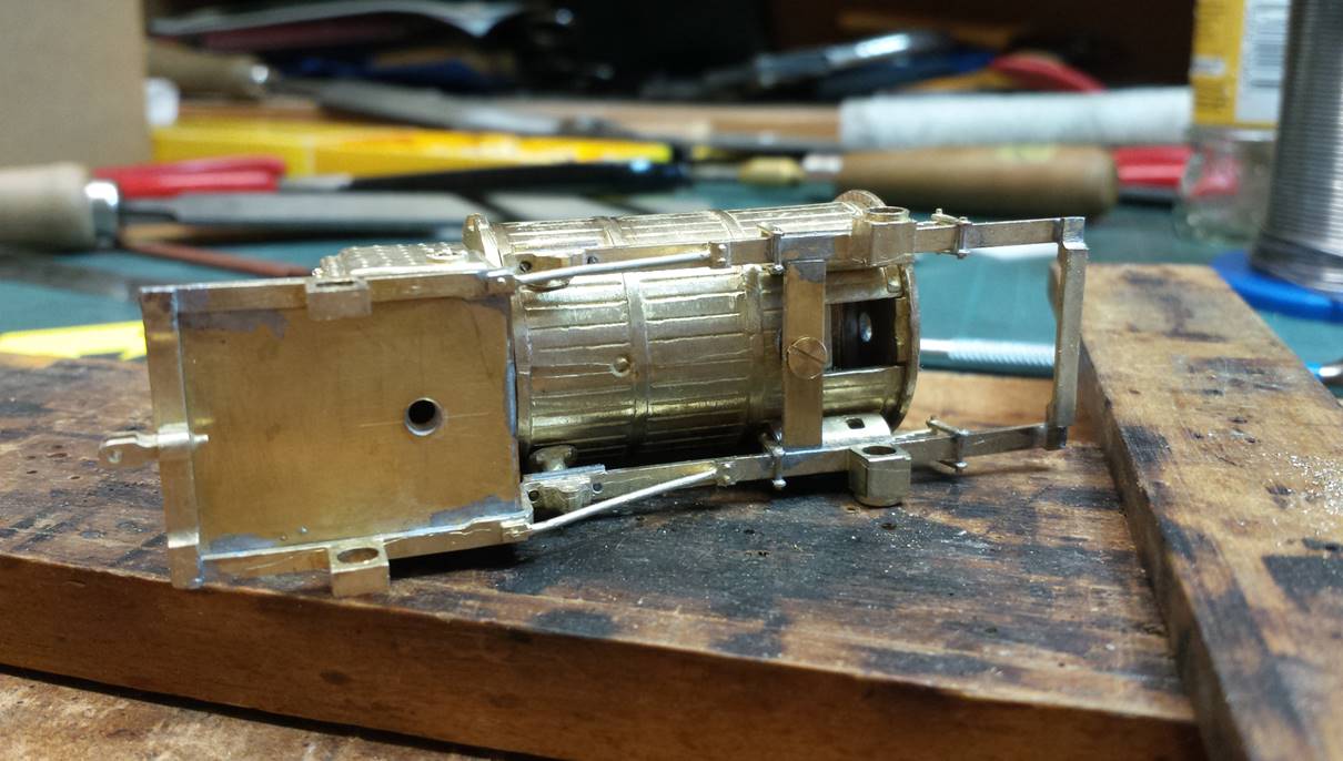 Dave H has continued to assemble the model of the Rocket to act as a trophy for a new Gauge 0 Guild competition in memory of Bob Alderman. He figured out how to make the thing screw together so that he can paint the boiler barrel separately from the rest (which is mostly black). The rear boiler plate was soldered to the firebox, then the front plate (which will have the chimney soldered to it) was screwed on using a bit of channel soldered across the inside of the boiler near the front. After that the whole boiler was secured in place with a screw from underneath, locating onto the back plate. It’s a bit rough and ready ([Ed} this is most unlikely), but it all fits together quite solidly.