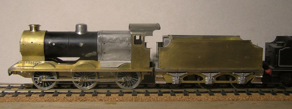 The original shallow etched running plate valances were replaced with 1.5mm deep brass angle, and new fastenings for the loco body provided to suit the modified SEF 4F chassis. The body was then raised 0.5mm on the chassis to get the correct ride height. The wheels are nicely centred on the splashers with just enough clearance – two different manufacturers getting it right – or at least wrong in the same way! The tender needed to go up another 1mm to match the loco ride height, and a tender coupling installed. In the fraught process of removing the old valance from the tender one of the leaf spring ends was caught with the iron. 😦