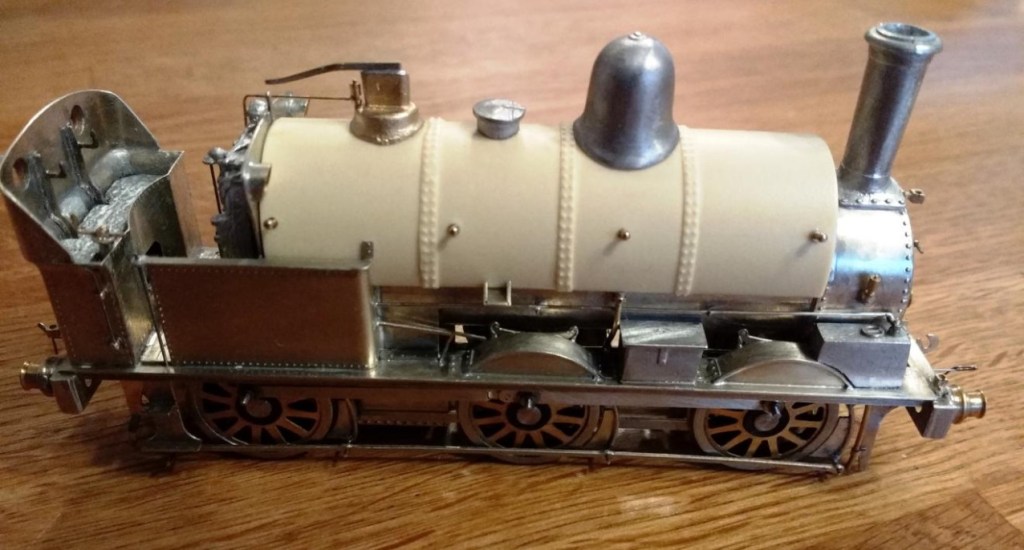 The steps have been attached, as have the sandboxes. Those steps on the coupling rod ‘splashers’ were the very devil to attach. It would have been easy if John had three hands! The photos show some flux corrosion even though he rinsed it after each modelling session. A horrible glass fibre pen will need to be used which John has learned to use under water to minimise bits of fibreglass getting in his fingers.