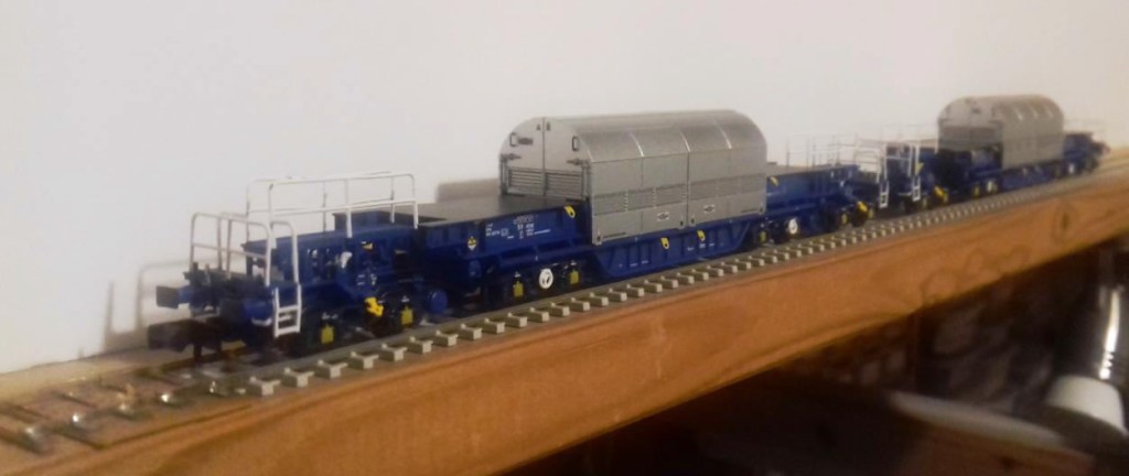 Changing tack entirely, Jim has dug out some of his recent N Gauge purchases to see what scope there was to replace the wheelsets with finescale ones readily available to members of the 2mm Scale Association – rather than have the N scale ones turned down in a lathe. The majority of the recent purchases have been various types of bogie container wagons, which have 5.25mm diameter wheels. However, something slightly different was a pair of KUA nuclear flask wagons, designed to carry fuel to and from Sellafield and Rosyth and Devonport for our nuclear submarine fleet.