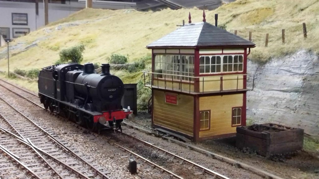 It was nice to see “The Summit” back so that all sorts of stock could stretch its legs. In the shot below, Jim’s 4F (purchased already constructed, but now modified) is sitting in the lay by siding by the signal box whilst the driver complains to the signalman about the poor current collection, affecting its slow running. The signalman is suggesting (a) installing pick-ups on the tender wheels and/or (b) cleaning the driving wheels!