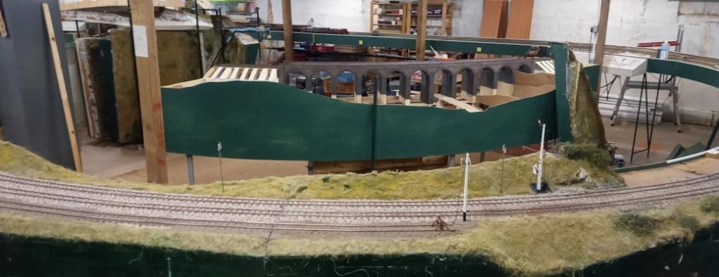 In the view below glimpsed across the spine boards of The Summit is the Evercreech New board for Prestleigh Viaduct with a start made on some very extensive landscaping.