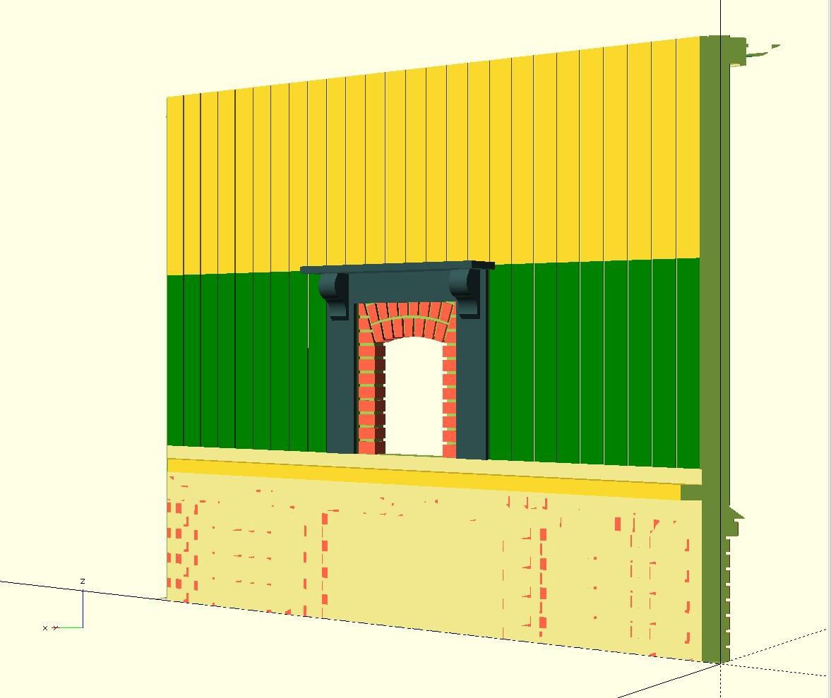 QCAD has been used for the basic 2D drawings, and OpenSCAD to extrude, and move the pieces into position – all on a trusty Windows 7 laptop from 2011! The canopy elevation of the box is also complete and was probably unique in that the original diagonal framing had not been weather boarded and was mostly hidden behind poster boards. I’m contemplating modelling the whole box with and without the weatherboarding and fancy valancing because it’s really not much more work compared with all that crazy brickwork on the chimney, where the depth of the mortar can be varied with another parameter!