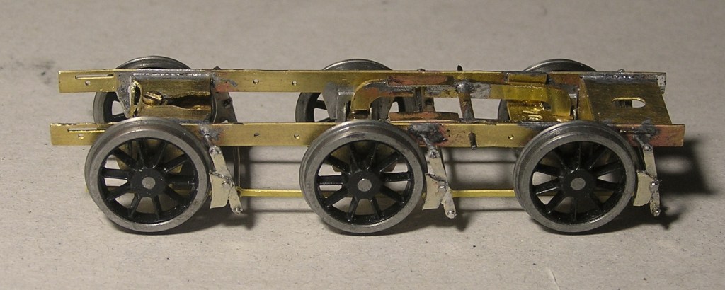 The Hornby tender hasn’t escaped Scot free either. Hornby supplied the 13′ wheelbase tender with their T9 even though most if not all T9s post-nationalisation had 14′ wheelbase tenders. Hornby did supply a 14′ wheelbase tender with their 700, and since the tanks are the same, and it is possible to buy the 14′ frames and keeper plate as a spare, the 13′ wheelbase chassis can be converted to 14′ with just a little bit of soldering to refit the loom. The uncompensated chassis didn’t ride well on EM track, so a Comet etched chassis has been fitted instead, and as none of the supplied brake blocks looked remotely LSWR, a new set was fretted out as per Steve’s Jidenco 700 conversion.