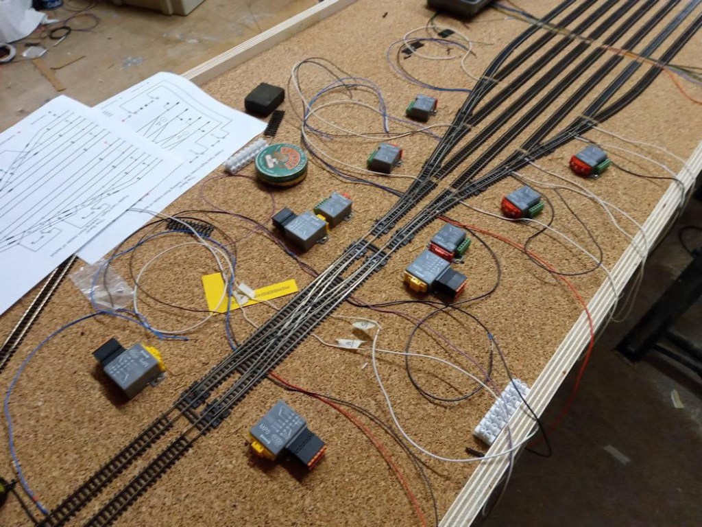 Point motors have been installed with associated wiring now well in progress. Note the wiring diagram in top left corner of the above picture – always useful to have! Work continues on Holly Junction and Heyno Junction (00 Gauge DCC), and minor repairs and upgrades continue on the venerable South Junction (EM Gauge DC).