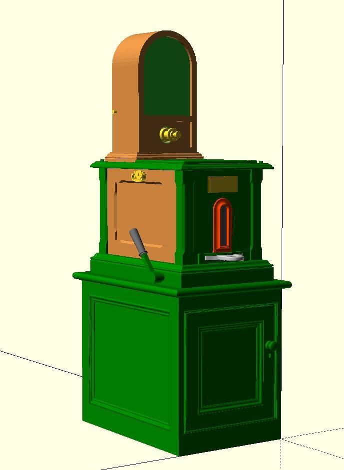 Next up is the Instrument Shelf based on photos of Verwood. This therefore has instruments for a passing loop with bell at one end and gong at the other, plus an extra bell possibly for the ground frame hut or shunter. Next to it is my interpretation of a Tyer’s No.6 Electric Tablet Instrument. Verwood should have had two of these, but the West Moors instrument was in a part of the box that wasn’t photographed so I’ve assumed that this was logically at the West Moors end of the frame mirroring the Fordingbridge instrument at the other end. The poles that the shelf was mounted on will be replaced by holes for wires in the final print.