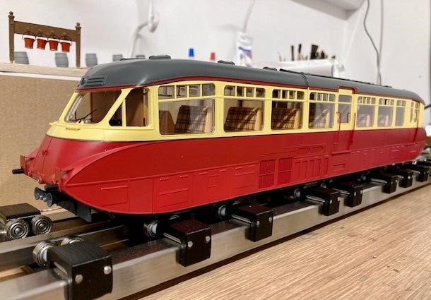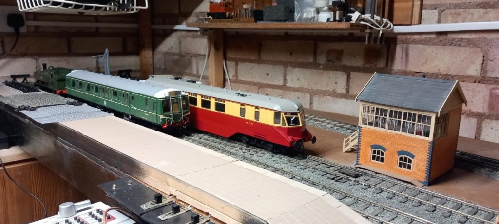Jim A has splashed out on two 7mm scale diesel railcars for his Forest of Dean themed shunting plank which is housed in his garage. The green “bubble car” represents the last period on his layout before closure, whereas the former GWR railcar represents the 1950s. The former is Dapol, the latter Heljan.