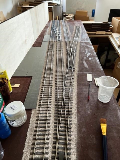 Without giving too much away (like how he did it), Dom has spent a couple of weeks on crutches, thus gaining quite a bit of modelling time, and so has made progress on 4mm scale Combe Town. The point rodding is down on the first scenic board, he’s made a good start on the ground cover in the yard, and the road embankment up to the bridge has grown hedges. His 14xx has gained sound, and the obligatory Modelu crew has been painted and have clambered aboard. Happily he was quickly back on his feet, and expected progress to slow again.