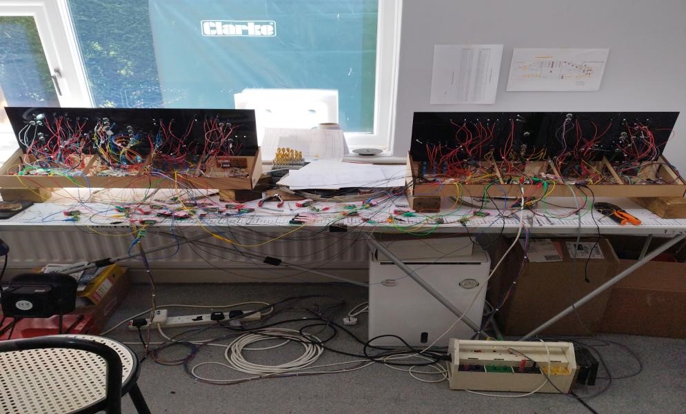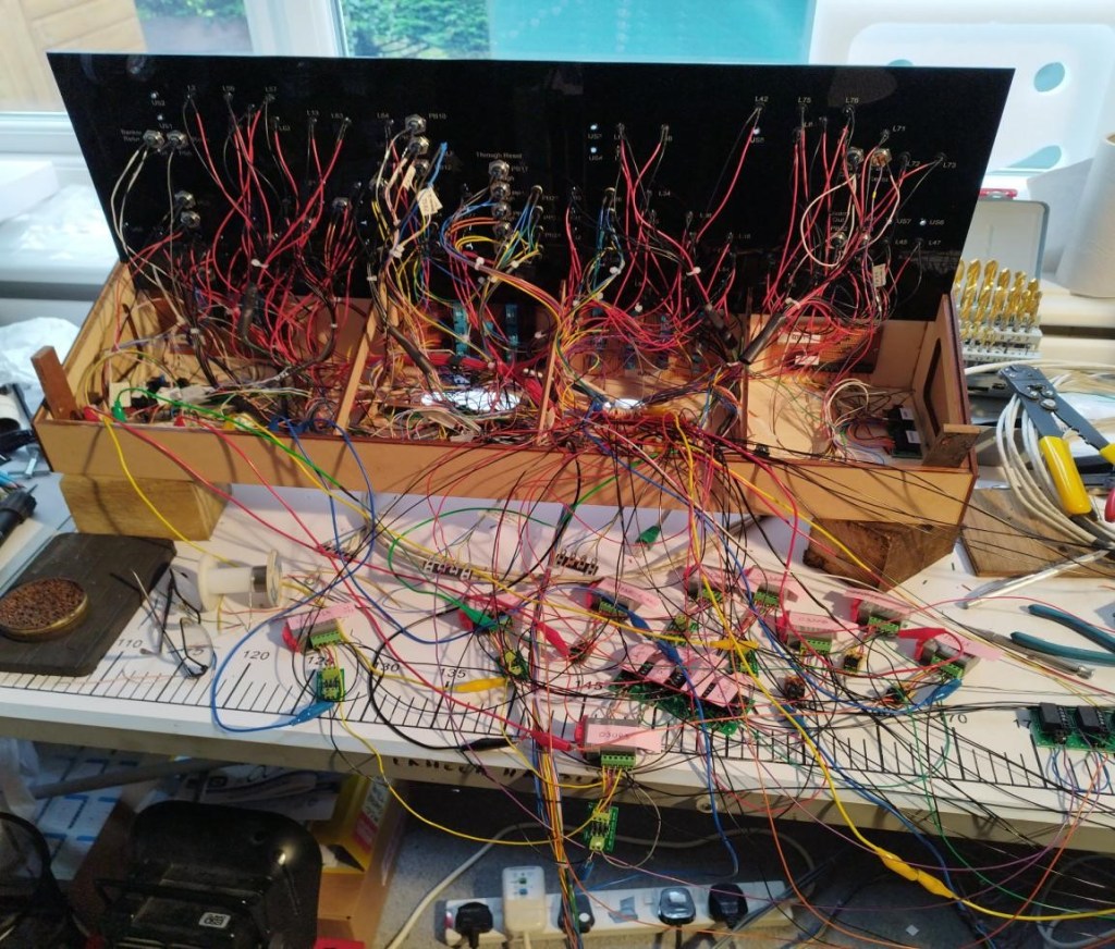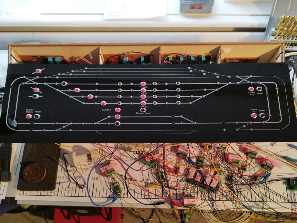 The finished panels in testing mode with a rats nest of wires connecting the panels to point motors etc to simulate the layout.