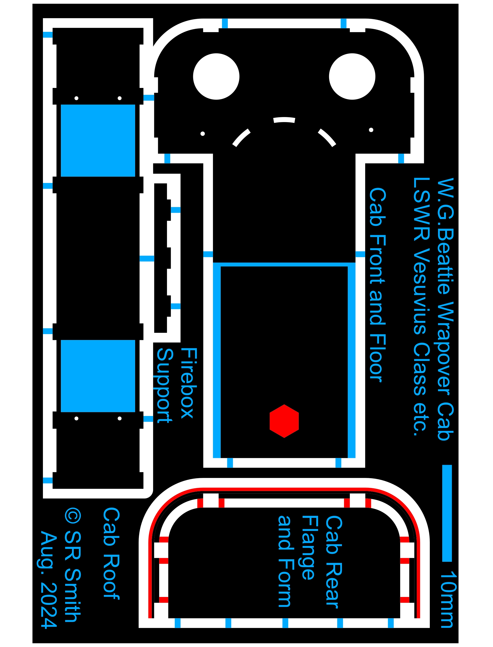 Below is the home made artwork for all the etched parts that Steve thinks is needed to make a Vesuvius Class body from a Falcon Class kit. All done in QCAD, it was a steep learning curve to work out a method to allow for cusp, and put in moats and tabs in a way that was fully reworkable. Black is no etch, blue is half etch from front, red is half etch from rear, The phototool is a one off, up-front cost, enabling about five copies, It was thought that a modular approach was the way to go, but with the minimum order being a 290mm x 135mm sheet, these two plus the three larger etches to build the engine and tender chassis, almost fill a sheet to make one big etch. This means that any revisions from the test build will require a completely new phototool.
