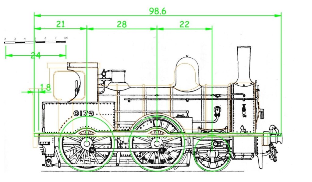 Missing so far from Steve’s putative recreation of the Downton Train Crash of 1884 is the Lion Class pilot engine Stour of 1869. So over the Christmas Holiday options were explored for modelling this Nine Elms built contemporary of the more well known Beyer Peacock built Double Framed Goods. This process turned out to be slippery slope. There were over forty examples of the class, and there are photos of a subset of these engines in Bradley, but none of Stour. The only drawing available was from the Locomotive Magazine from 1933 published in Mike Sharman’s collection of drawings. This is only a side view, but it was scanned, scaled and traced in QCAD and a start was made on developing plan, front and rear elevations from the very few known dimensions.