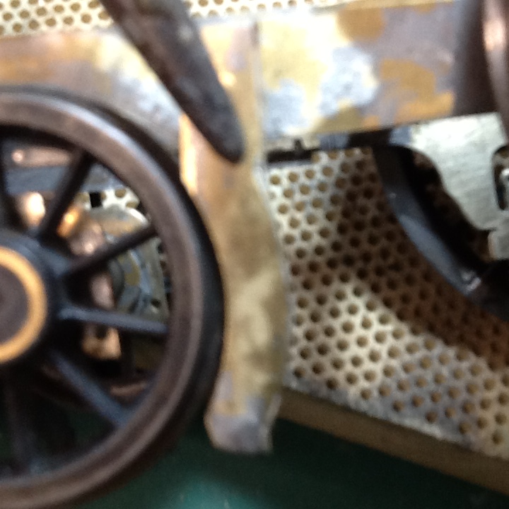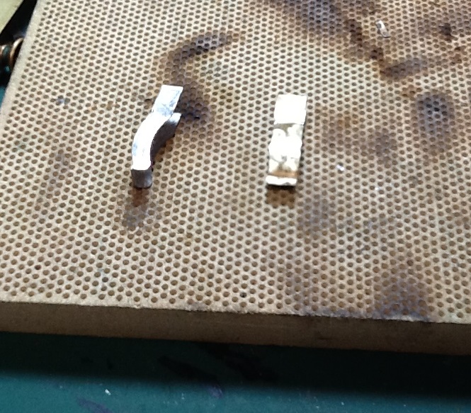 The Clauds had splashers for the bogie wheels which were quite decorative and the locos retained these on rebuilding. None of the etchings acquired over the years had parts to build them, so these are made out of three pieces of brass and the photo shows where they will be located. A club e-mail exchange has established that these parts are being assembled on a well used example of the very finest sort of ceramic soldering mat! We would definitely like to see a lot more of this engine!