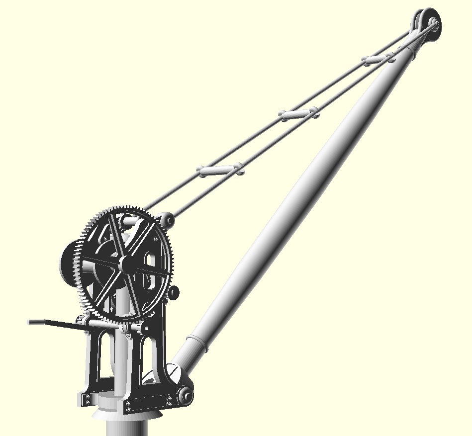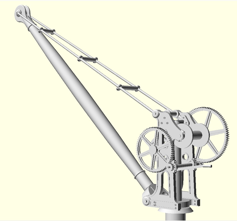The model crane has been drawn up as a series of 2D drawings in QCAD which have been extruded and then assembled in OpenSCAD an approach which worked extremely well enabling me to produce the initial 3D model within a week of downloading OpenSCAD. At this stage a test 3D print was ordered, and it was the crane assembled from this test print that was shown at the South Western Circle meeting at West Byfleet in October 2019, and that can be seen in the feature on Semley in the January 2021 edition of Model Rail. Once viewed in position on Semley the 3D CAD was significantly reworked to improve the scale and proportions. In particular the jib has been significantly beefed up, the size of the frame reduced to set the crank height at 3′, and the stance of the crane improved by widening the frames slightly.