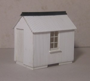 The model is a two layer sandwich of a thin corrugated plastic sheeting using epoxy resin as the filling to try to avoid warping through solvent abuse. It’s likely that this is (or was) a Slaters product. A representation of the internal framing was added since all photographs show the door ajar. For the rivet counters amongst you there are in fact four corrugations where there should be five, something I hadn’t twigged when I used it for the lamp hut. As this is an EM Gauge hut that can be lived with since suddenly it’s all about artistic effect. Plus there’s enough of the stuff left over for weighbridge hut and canopy roof.